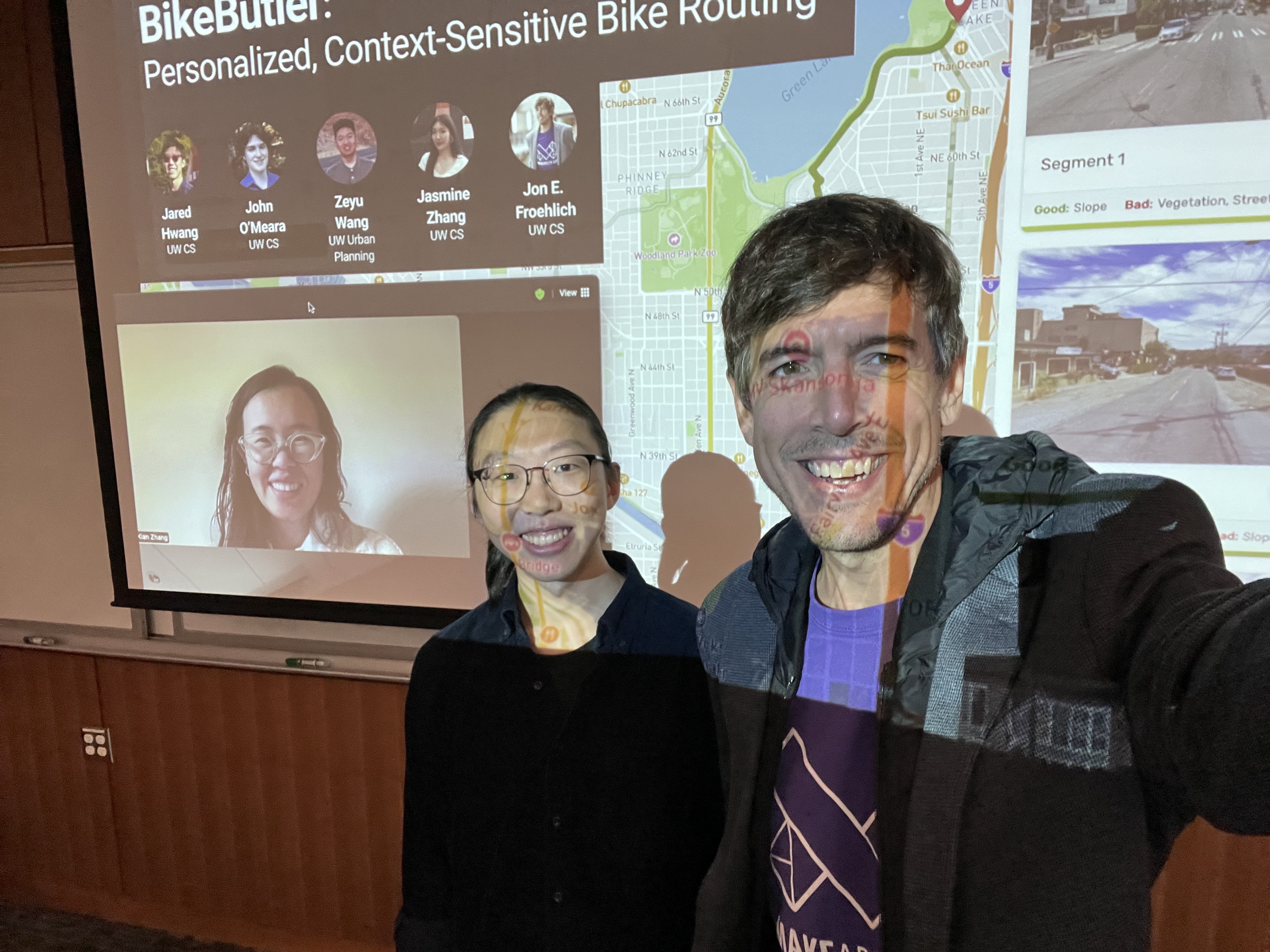 Congrats to Jared Hwang for successfuly presenting his qualifying project entitled "BikeButler: Creating and Previewing Personalized, Context-Sensitive Bicycle Routes." Jared thoughtfully presented his mixed-methods design, multimodal bikeability pipeline, and novel context-sensitive bike route navigation tool.